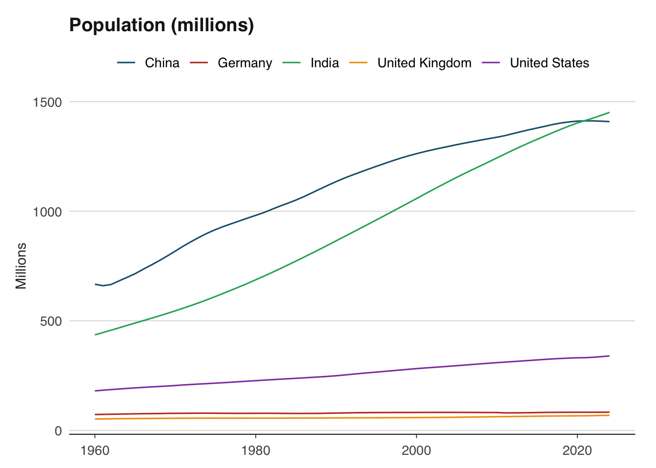 ggplot(pop, aes(x = year, y = SP.POP.TOTL / 1e6, colour = country)) +