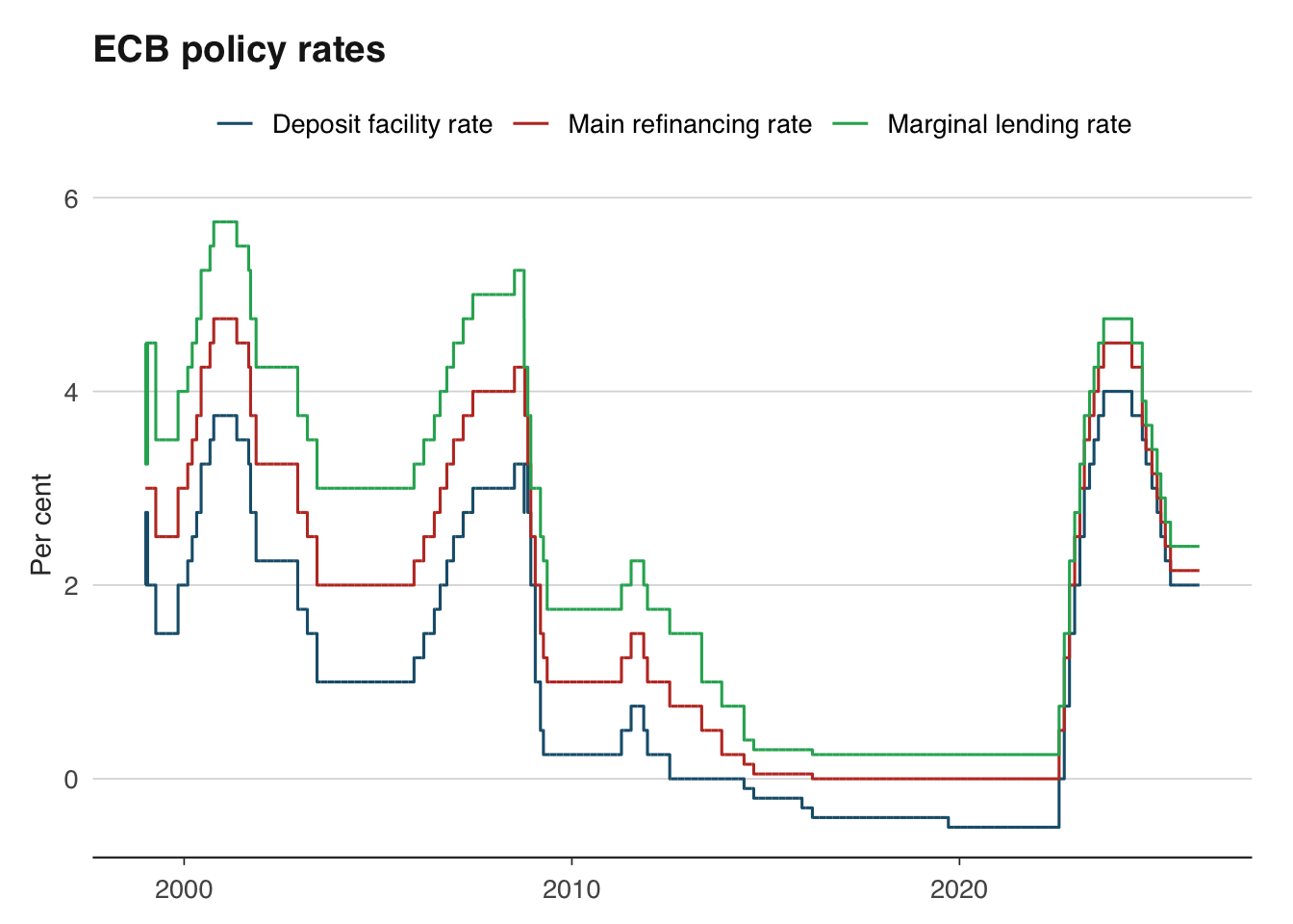 The ECB sets three key interest rates: the main refinancing rate (the rate at which banks can borrow from the ECB for one week), the marginal lending facility rate (overnight borrowing), and the deposit facility rate (overnight deposits). Since September 2024, the deposit facility rate has been the primary instrument for steering monetary policy.
