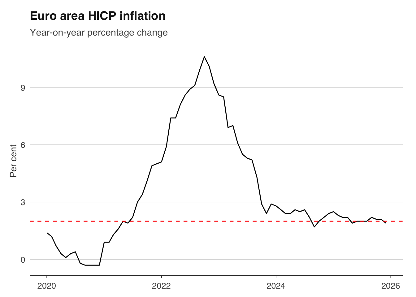 You can pass ISO 2-letter country codes to ecb_hicp() to pull HICP for individual member states. Omitting the country code returns the aggregate euro area HICP. This is the series that the ECB targets at 2 per cent over the medium term.