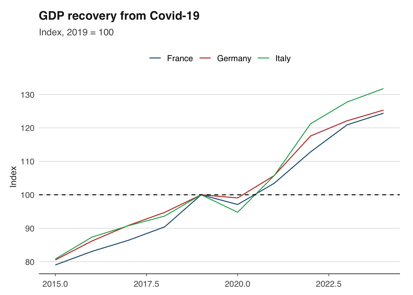 3. Rebase the ECB's HICP index for Germany and France to January 2015 = 100. Then rebase both to January 2020 = 100. Plot the rebased series. Which country has seen faster cumulative inflation since January 2020?