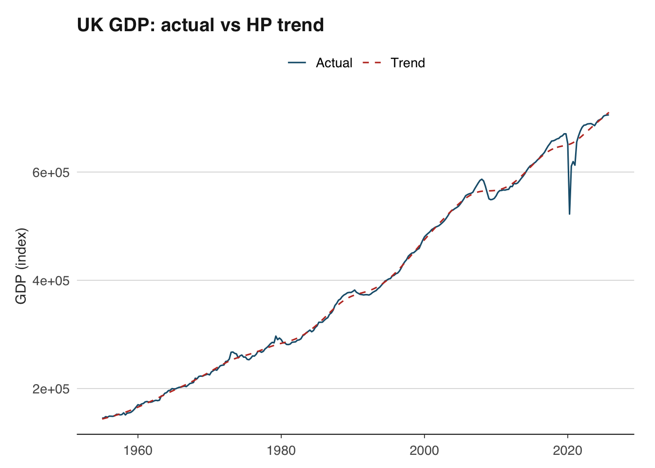 The `hpfilter()` function returns the trend component and the cyclical component. The cyclical component is the output gap — positive values indicate the economy is running above trend, negative values below.