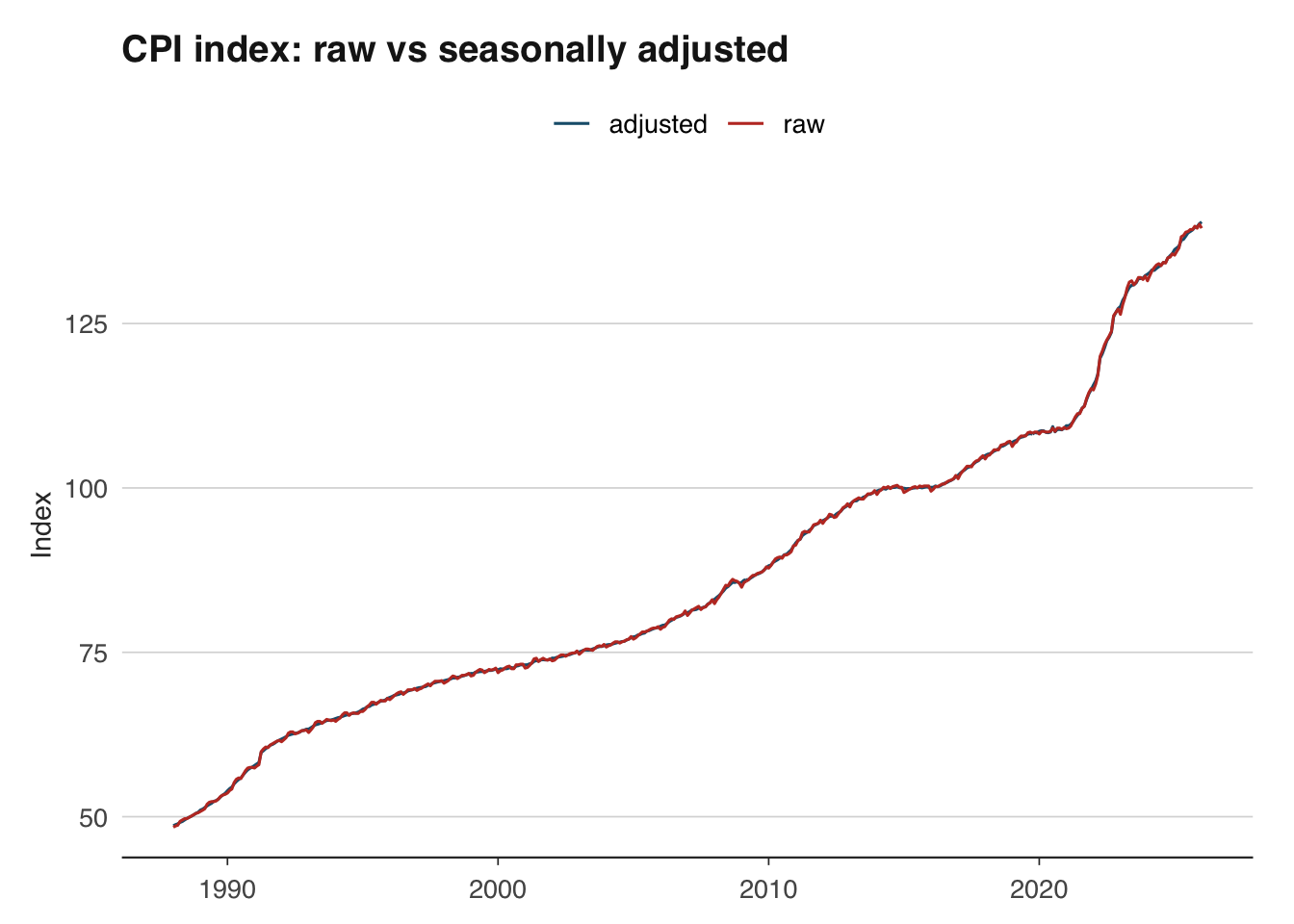 Most official data sources publish both raw and seasonally adjusted series. When the adjusted version is available, use it directly rather than adjusting the raw data yourself — the statistical office will have applied more sophisticated calendar and trading-day corrections than a simple `seas()` call can achieve. Do your own seasonal adjustment only when working with series that are not published in adjusted form, such as certain tax receipt series from HMRC.