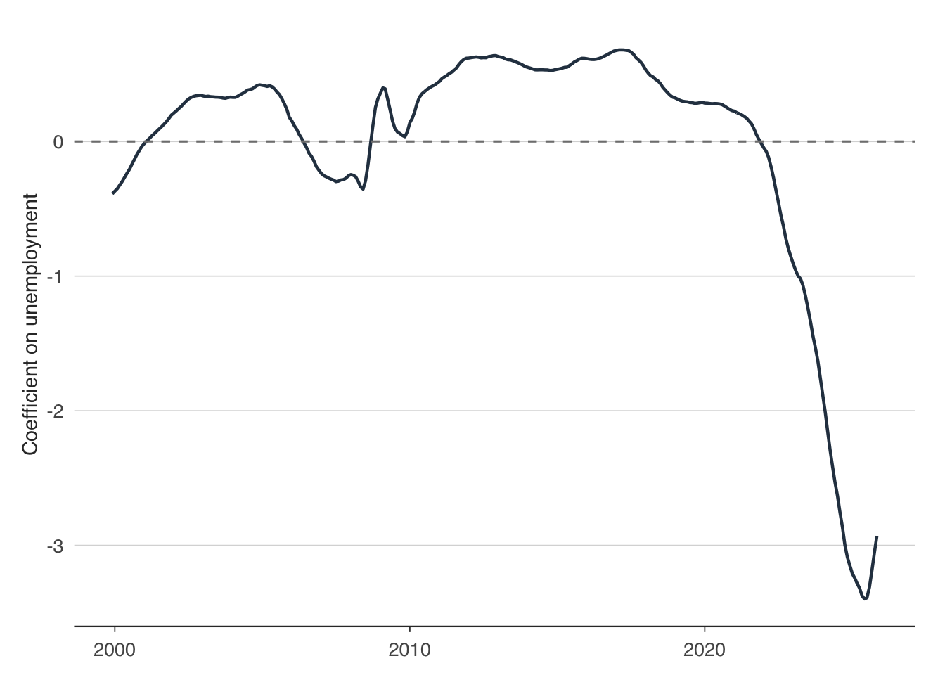 The chart tells a story in three acts. During the early part of the sample, the slope is meaningfully negative — a 1 percentage point rise in unemployment is associated with a substantial fall in inflation. Through the 2000s and 2010s, the slope drifts towards zero: the Great Moderation and inflation targeting anchored expectations so firmly that unemployment had little impact on inflation. This is the “flattening” that exercised so many economists.