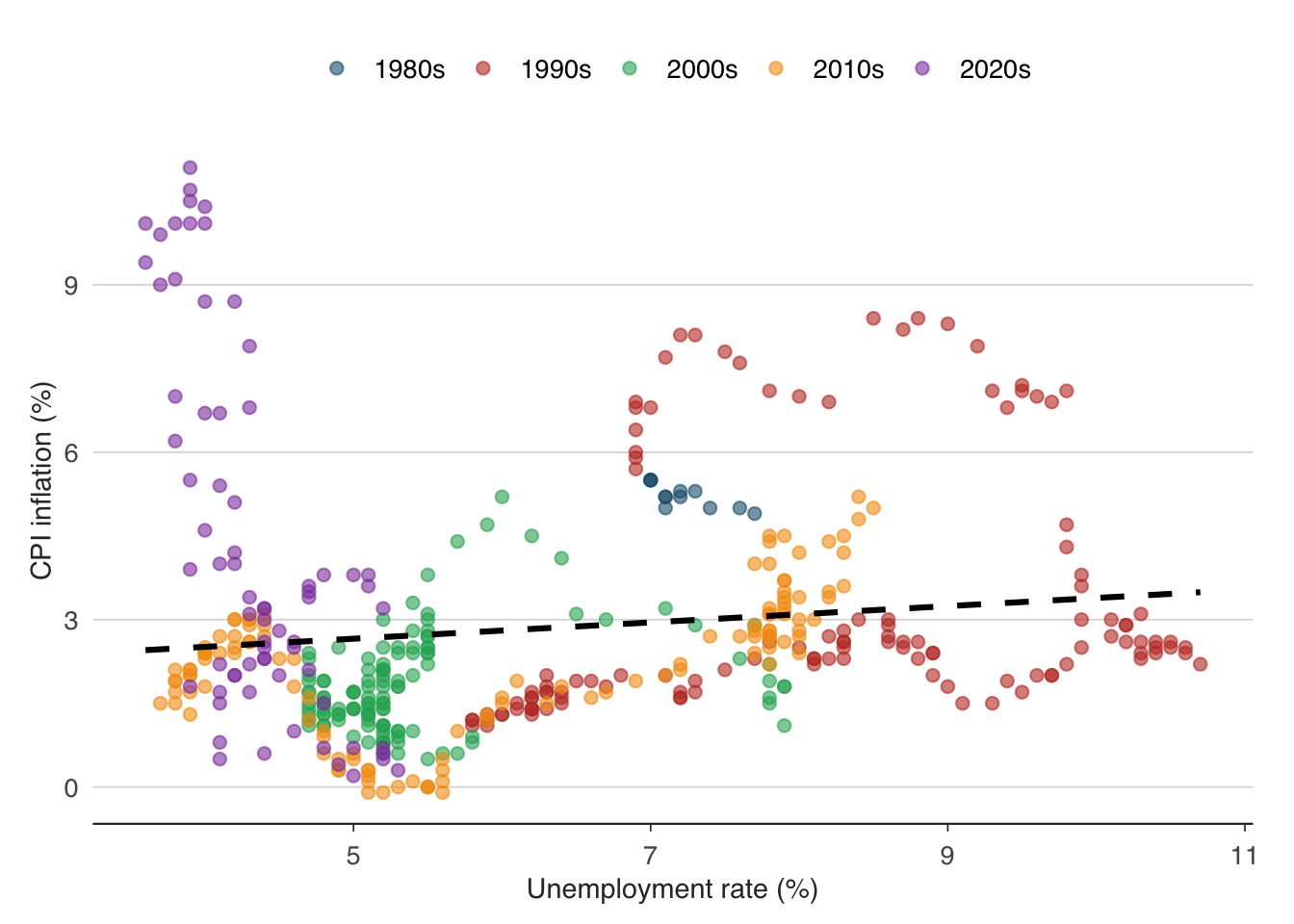 The colouring by decade reveals something important: the points do not sit on a single stable curve. The relationship appears to shift across decades, exactly as the expectations-augmented theory predicts. Each decade has its own cluster, reflecting different inflation expectations regimes.