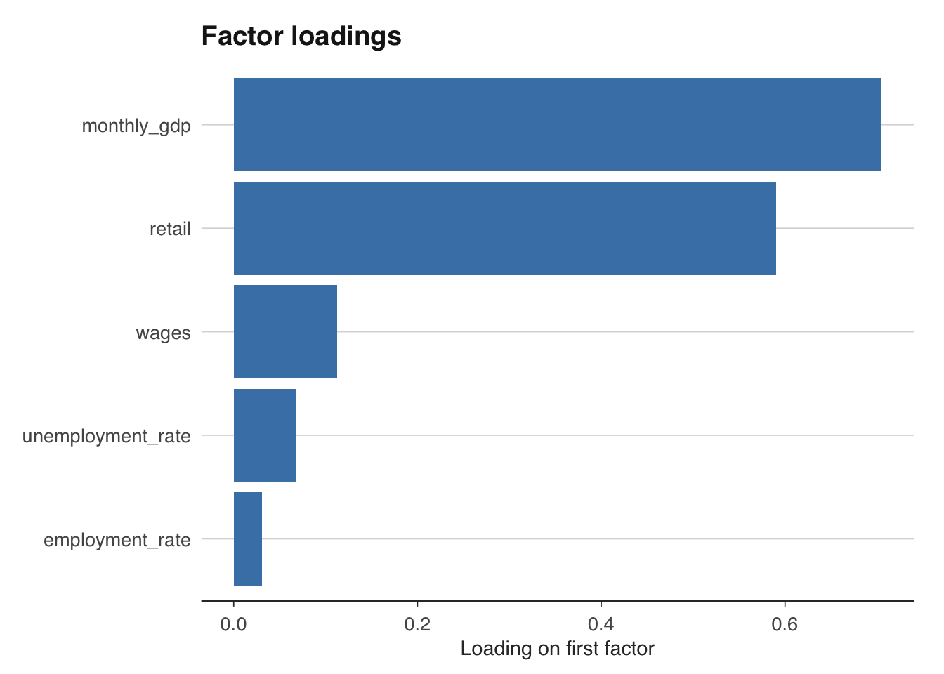 labs(title = "Factor loadings", x = NULL, y = "Loading on first factor") +